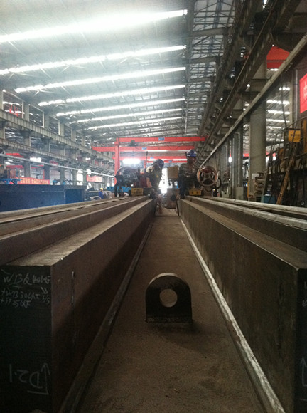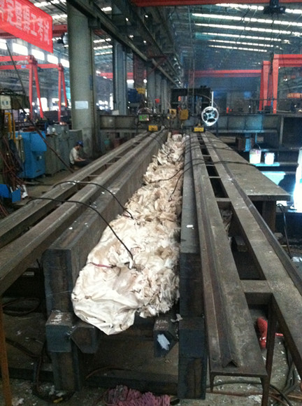 構件采用定位焊,焊前預熱溫度不低于120。焊接時(shí),嚴格控制焊接熱輸入,長(cháng)度方向上焊接方向一致,從中間向兩側對稱(chēng)施焊,使用氣體保護焊+埋弧焊進(jìn)行焊接,首先用氣保焊在35°方向打底,用埋弧焊填充2-3;翻身清根,清根后在45°側用埋弧焊填充,把35°側產(chǎn)生的變形完全抵消(即板變平)為止;然后翻身把35°側再填充2-3;再翻身填充45°側,把35°側產(chǎn)生的變形完全抵消(即板變平)為止;再翻身填充35°側,以此下去直到蓋面。整個(gè)焊接過(guò)程歷時(shí)7天,共計168個(gè)小時(shí)不間斷焊接施工。構件未發(fā)生變形,構件外形尺寸符合現行GB50205-2001《鋼結構工程施工質(zhì)量驗收規范》;UT、磁粉檢查合格率均達到100%。
