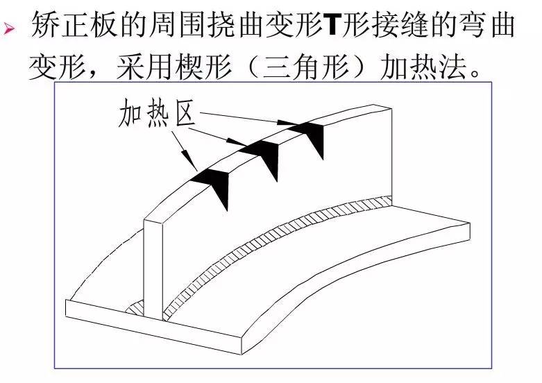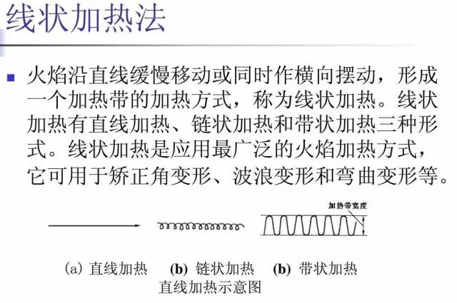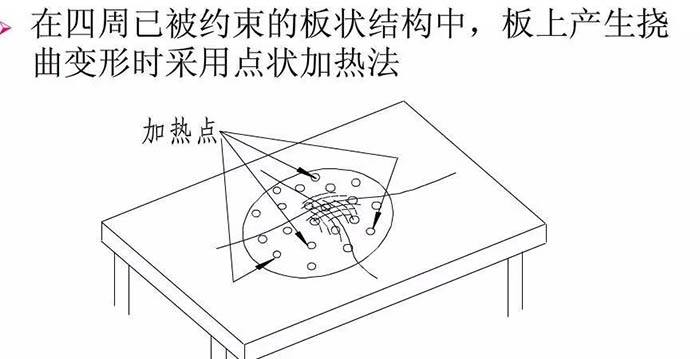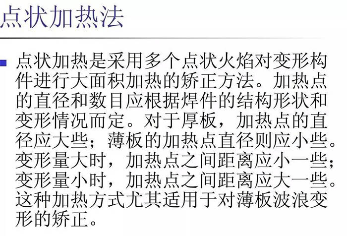 即利用不均勻的加熱使結構獲得反向的變形來(lái)補償或抵消原來(lái)的焊接變形。加熱矯正法的加熱方法可分為點(diǎn)狀加熱、線(xiàn)狀加熱、三角形加熱。加熱矯正能消除很多施力矯正無(wú)法解決的變形,掌握火焰局部加熱引起的變形的規律是做好矯正的關(guān)鍵,決定火焰矯正效果主要是加熱的位置和加熱溫度。