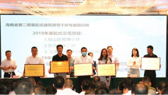 開(kāi)班儀式上還為省住房和城鄉建設廳組織評審出的2019年裝配式建筑3個(gè)示范項目“瓊山區椰博小學(xué)”“三亞崖州灣科技城產(chǎn)業(yè)促進(jìn)中心”“東方之珠二期” 和2個(gè)示范基地“海南創(chuàng )藍易筑裝配式建筑技術(shù)有限公司生產(chǎn)基地”“途會(huì )裝配式建筑產(chǎn)業(yè)園(海南)有限公司基地”進(jìn)行了授牌。