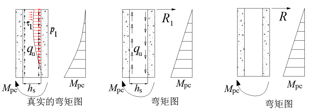 圖2中,界面上其他的力是水平方向的,這些力代表了外包層是混凝土的支座,水平力傳給了混凝土,外包混凝土的水平截面內的剪力即來(lái)自這些界面水平作用力。