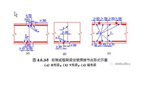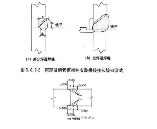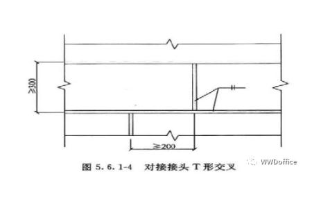 5.6.1  4 要求焊縫與母材等強和承受動(dòng)荷載的對接接頭,其縱橫兩方向的對接縫,宜采用T形交叉,交叉點(diǎn)的距離不宜小于200mm,且拼接料的長(cháng)度和寬度不宜小于300mm,如有特殊要求,施工圖應注明焊縫的位置。
