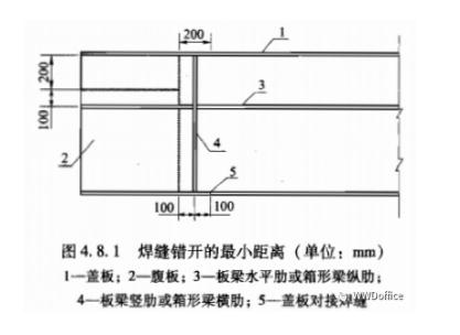 2 板梁的腹板和箱型梁的蓋、腹板接料焊縫可為十字形或T字形,T字形交叉點(diǎn)間距不得小于200mm,腹板縱向接料焊縫宜布置在受壓區。