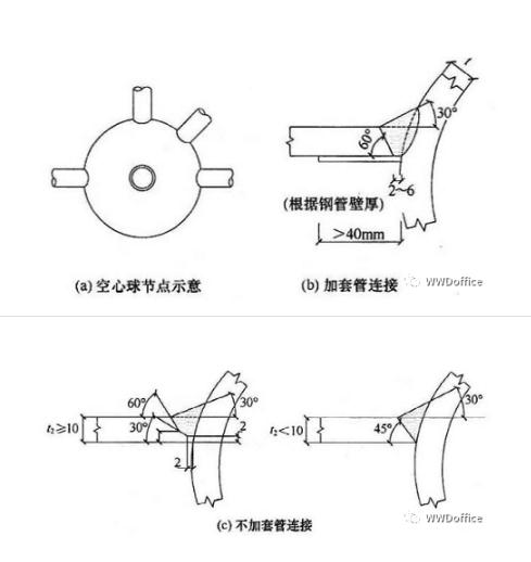 5 管材與空心球工地安裝焊接節點(diǎn)應采取下列形式: