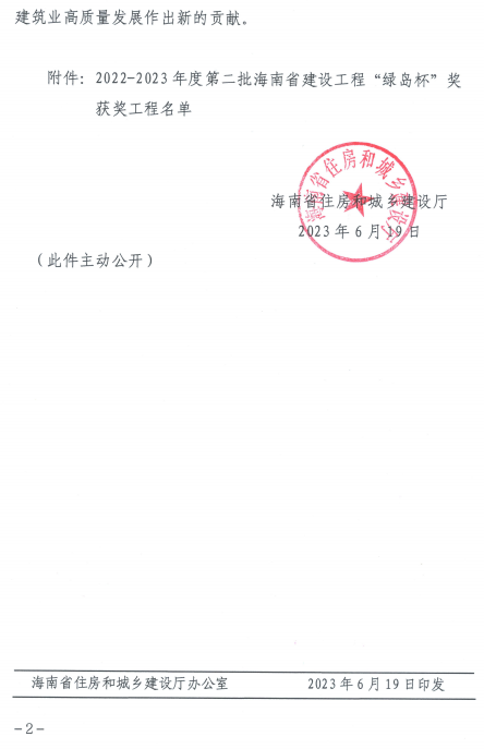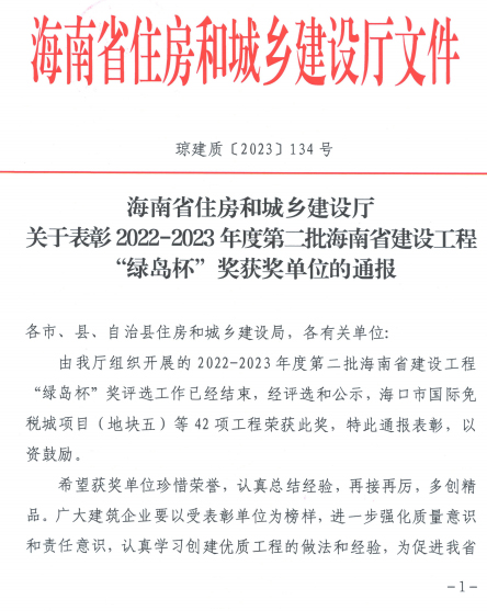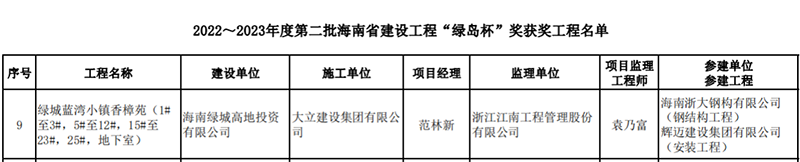 近日,海南省住房和城鄉建設廳公布第2022-2023年度第二批海南省建設工程“綠島杯”獎獲獎工程名單。由海南浙大鋼構有限公司承建的海南綠城藍灣小鎮香樟苑項目榮獲“綠島杯”獎!熬G島杯”獎是海南省建設工程質(zhì)量最高榮譽(yù)獎,工程質(zhì)量達到了省內先進(jìn)水平。